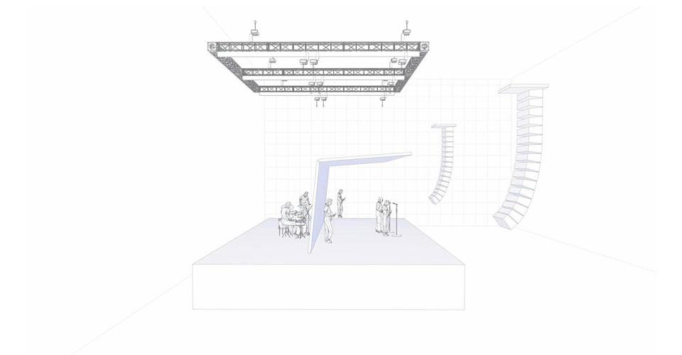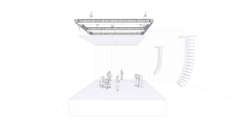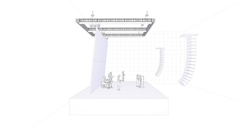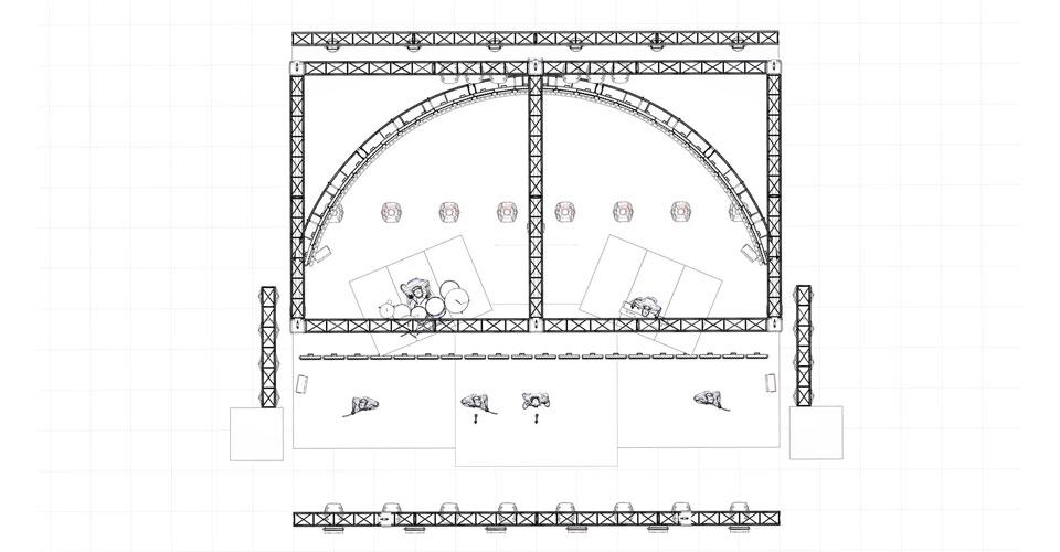 Благодаря продуманной сценической конструкции, сценография шоу «Горизонт событий» очень корректно масштабируется, концепция шоу не меняется, а результат повторяем практически на любой площадке. Конечно, в первую очередь для размещения конструкции необходима высота зала – от пола до точек подвеса не менее 10 метров, иначе экран не сможет совершить поворот из вертикальной плоскости в горизонтальную. Большинство площадок соответствует этим требованиям, за исключением тех, где несмотря на наличие нужной высоты, сам конструктив потолка не позволяет подвешивать такой вес. В таких случаях на помощь приходят специальные алюминиевые и леерные конструкции.