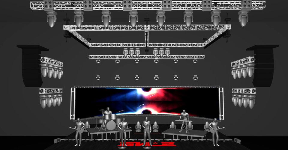 Чтобы получить идеально ровную дугу без изломов, мы разработали нестандартные полукруглые фермы со специальными стыковочными узлами, силовыми диагоналями и элементами для крепления светодиодного экрана. Облегчить вес рамы удалось за счет сочетания в конструкции алюминиевых и стальных элементов. Сейчас ее общий вес составляет 3700 кг, а за безопасное движение этих тонн металла над головами команды «Би-2» отвечают лебедки ChainMaster BGV-C1 VARIOLIFT на 1250 кг и система компьютерного управления ТМ IMLIGHT.