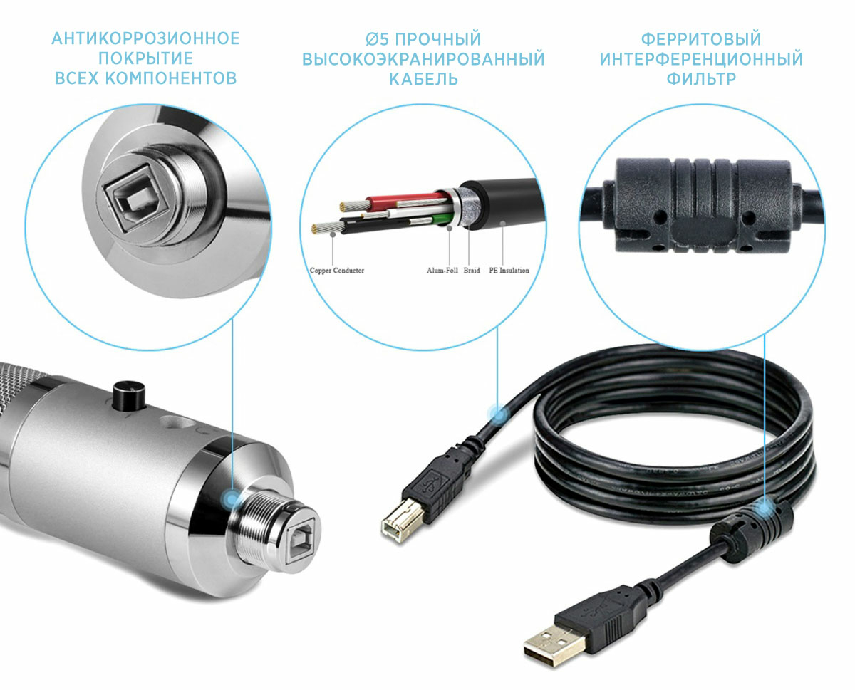 4. Даже USB-кабель, входящий в комплект CYBER MIC не так прост, как у конкурентов. Прежде всего, кабель отличается повышенной механической прочностью и помехозащищённостью. В конструкции кабеля применено двойное экранирование проводников, а также полимеры, уменьшающие конденсаторный эффект. В дополнение к привычным методам борьбы с помехами, USB-кабель оснащён ферритовым интерференционным фильтром, защищающим электрический сигнал от электромагнитных помех и наводок. Казалось бы - это всего лишь кабель для передачи цифрового сигнала, но в борьбе за эфир каждый герц и децибел должен быть на своём месте.