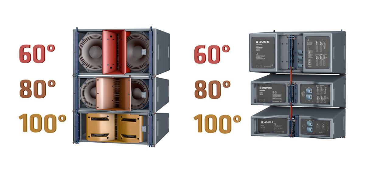 А именно. В серию COSMO входят следующие широкополосные элементы массива: COSMO 6, COSMO 8 и COSMO 10, с конфигурациями 2х6” + 1,4”, 2х8” + 1,4” и 2х10” + 2х1,4”. Каждый из типов систем имеет разную горизонтальную направленность – 100 градусов у С 6, 80 градусов у С 8 и 60 градусов у С 10. Но установочные габариты всех элементов одинаковые – 600х450 мм (высота кабинетов, естественно, разная). Общность установочных размеров и унифицированная система крепежа делают возможным соединение всех трёх типов кабинетов в один массив, что, в свою очередь, делает возможным желаемое сосредоточение звуковых волн определённого диапазона в обозначенном пространстве.