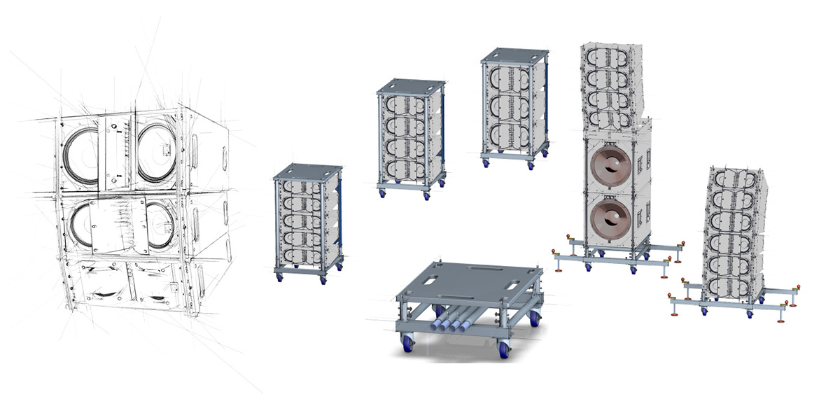 Модельный ряд аксессуаров серии COSMO невелик, так как многие «нужности» интегрированы в конструкцию корпусов элементов массива. Тем не менее, стоит обратить внимание на транспортировочные тележки, которые по сути являются и опорными рамами для граунд‑стеков, и защитным каркасом при длительной транспортировке комплекта.