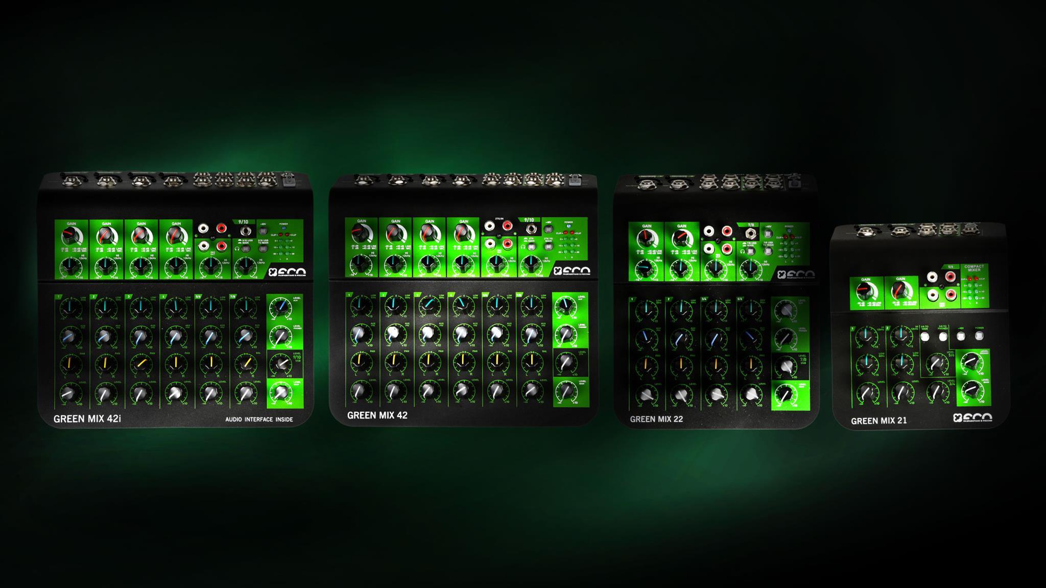 Новая серия компактных микшерных пультов предназначена для использования в малых и средних звуковых комплектах с небольшим количеством звуковых источников. Главной отличительной чертой микшерных пультов ЕСО серии GREEN MIX стала надёжность и простота управления. Эти обстоятельства позволяют использовать микшеры GREEN MIX не только в стационарных, но и в мобильных комплектах, где требования к механической прочности и надёжности существенно выше.