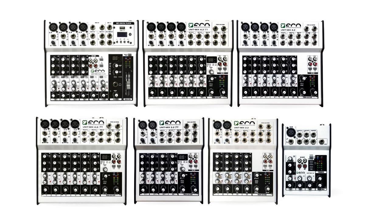 Следующая «партия» компактных микшеров так же была выпущена под логотипом торговой марки ЕСО – это серии UNIT-MIX и FADE-MIX. Группы микшеров объединены не только общим дизайном, но и целым рядом используемых компонентов – предусилители со сверхмалым уровнем шумов, аудиоинтерфейсы (звуковые платы), встроенные MP3-плееры и процессоры эффектов. Тем не менее существуют значительные различия в этих сериях, основанные на возможностях пользователя в работе со звуковыми комплектами не самых простейших конфигураций.