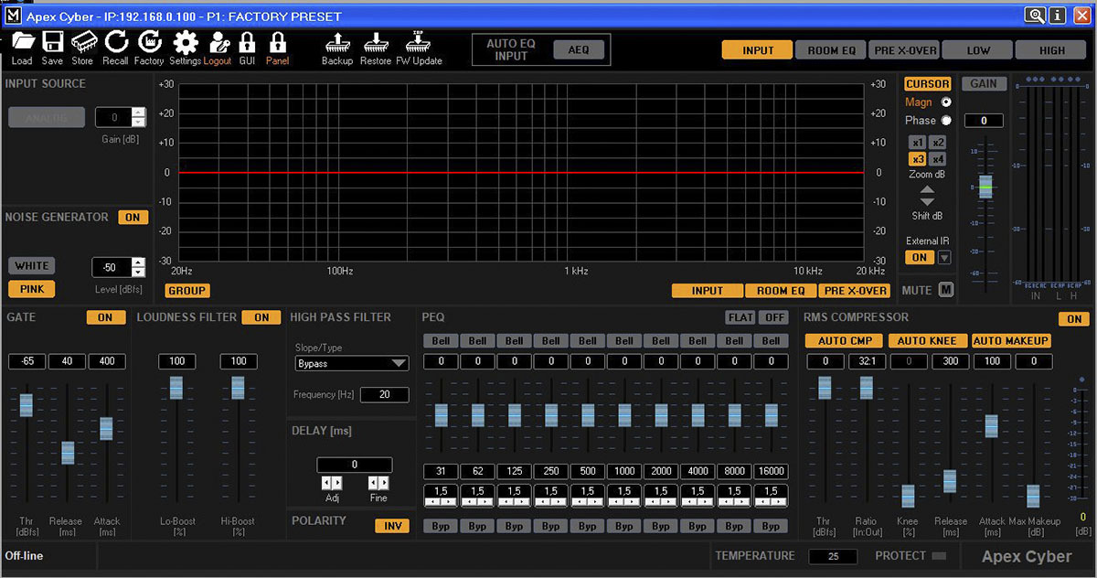 Обо всех возможностях управляющего процессора массива MASTERS DA VINCI CYBER лучше почитать в инструкции пользователя, прилагаемой к системам. Подключение акустических систем DA VINCI CYBER к источнику сигнала (микшеру или распределительному устройству) может производиться как через обычный аналоговый вход, так и посредством порта DANTE (опционально). Управляющий сетевой сигнал от ПК или коммутационного сетевого устройства подаётся посредством TCP/IP или DANTE.