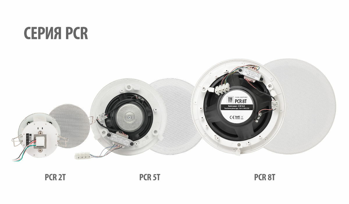 Громкоговорители серии PCR принадлежат к классу потолочных громкоговорителей для систем трансляции и аварийного оповещения со встроенным согласующим 100-вольтовым трансформатором. Серия состоит из трёх моделей – PCR 2T, PCR 5T, PCR 8T, где цифра в индексе означает размер НЧ-динамика в дюймах. Одной из примечательных черт конструкции громкоговорителей серии является отсутствие рамки вокруг декоративной решётки. Казалось бы, незначительный факт, но сколько дизайнеров удовлетворённо выдохнуло, найдя в каталоге АМС новые акустические системы PCR. Дело в том, что очень часто в громкоговорителях стальная защитная решётка и рамка имеют различные оттенки белого, которые со временем ещё больше расходятся. То есть потолок помещения приобретает замысловатый футуристический вид, что далеко не всегда по нраву его владельцам и посетителям.