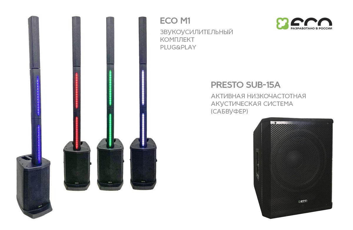 Немного особняком в PRESTO находится звуковая система колонного типа М1. Данный форм-фактор более дань моде, нежели техническая необходимость – создатели звуковых колонн тратят большую часть своих усилий на приближение звучания их творений к обычным акустическим системам. Но есть и некоторые плюсы звуковых колонн, которые всё-таки заставили ECO пойти на поводу желаний пользователей. Как и все системы PRESTO, М1 оснащена микшерным пультом, многоформатным аудиоплеером и LED-подсветкой.