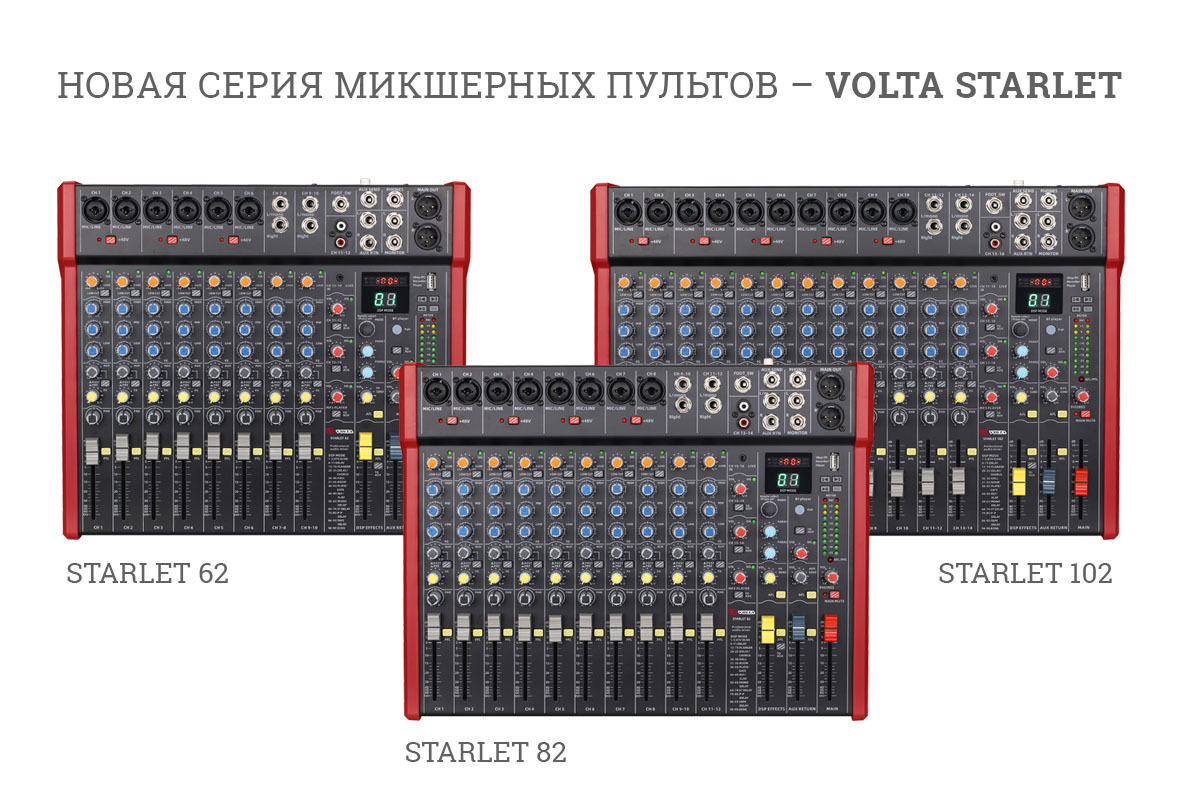 Модельный ряд аналоговых микшерных пультов VOLTA сейчас состоит из трёх серий, объединяющих в себе компактные модели (серия INTRO), среднеформатные (серия ARTIST) и микшеры-аудиоинтерфейсы (MEDIUM). Каждый может выбрать устройство в точности соответствующее его задачам и кошельку. Но время идёт, и российские пользователи стали требовать более универсальные микшеры для ежедневного применения, рассчитанные на самый широкий круг задач. Поэтому представляем новую серию микшерных пультов – VOLTA STARLET.