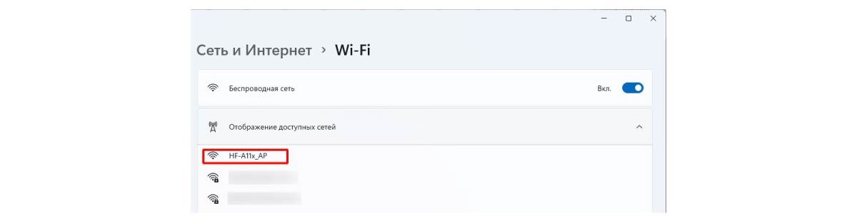 На ПК откройте Параметры → Сеть и Интернет → Wi-Fi. В списке доступных сетей выберите HF-A11x_AP. Подключитесь в данной сети. Вы увидите следующую информацию о подключении: