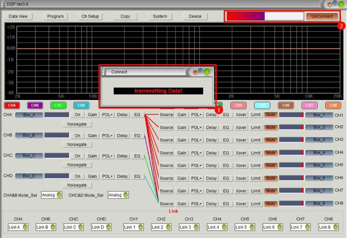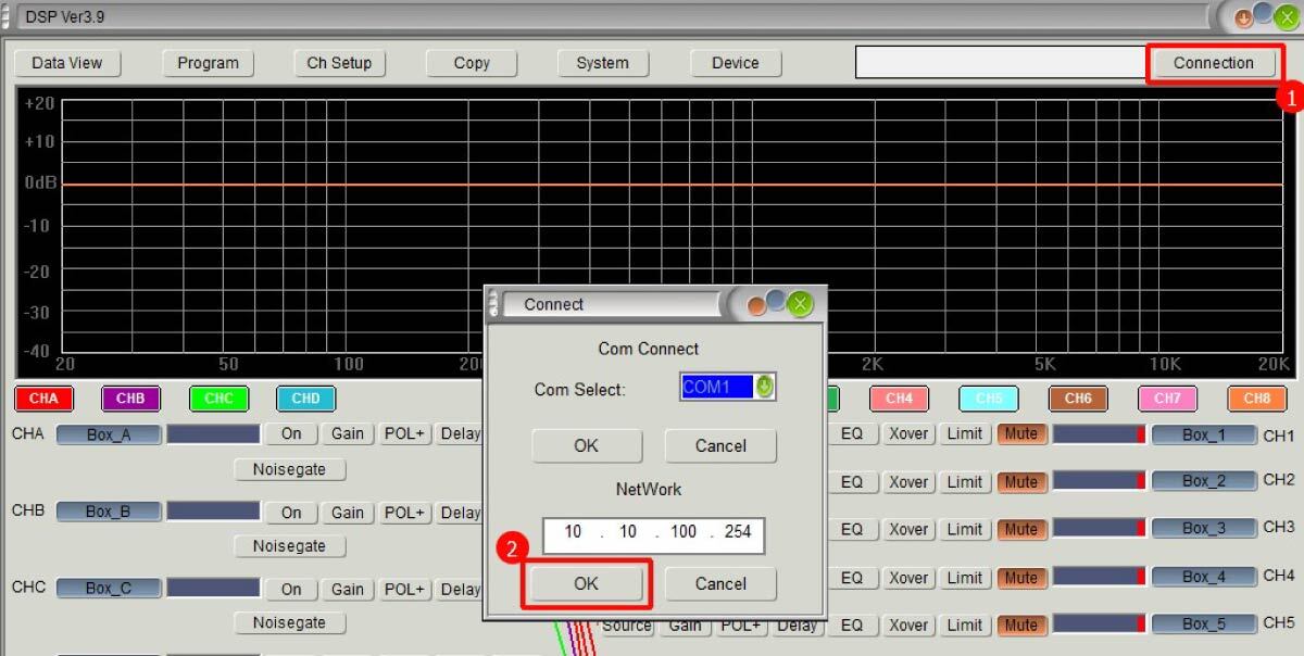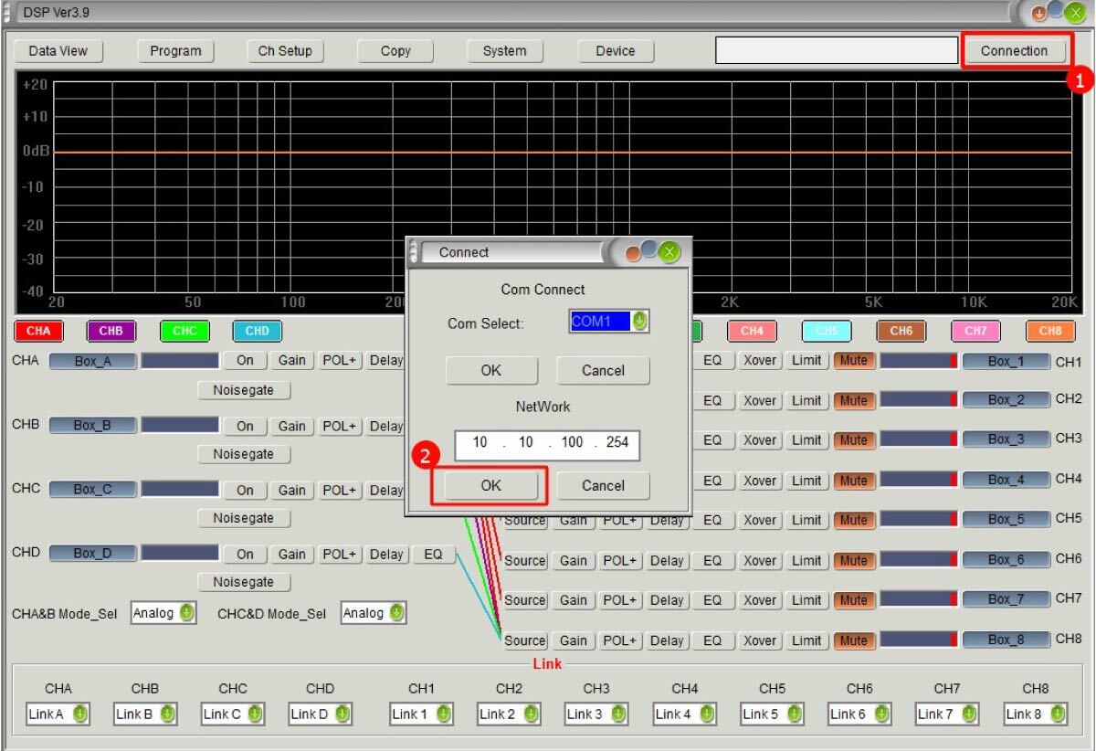 2. Откройте управляющее ПО для VOLTA DSP PRO. Нажмите на кнопку Connection ①, появится всплывающее окно для выбора типа подключения. Нажмите OK ②. См. рис. ниже: