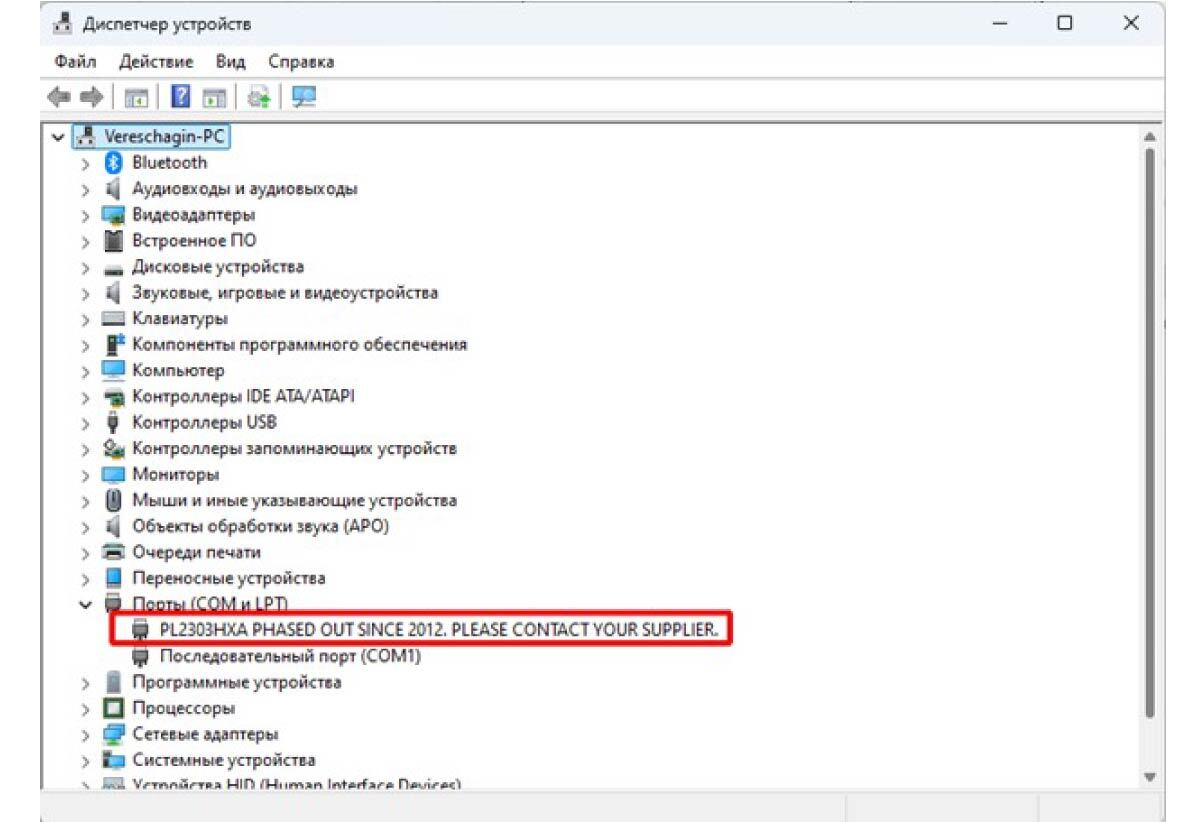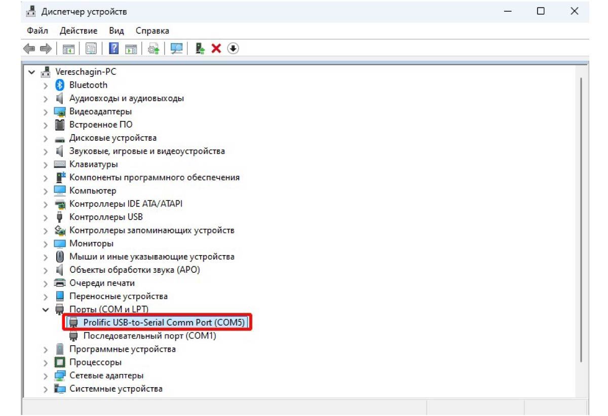 После этой процедуры вы увидите корректный порт Prolific USB-to-Serial Comm Port (номер COM-порта).