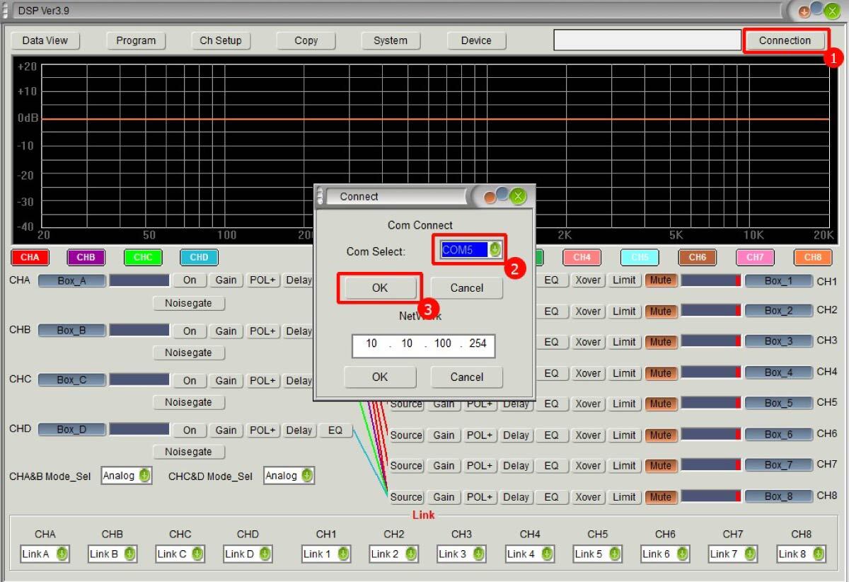 2. Откройте управляющее ПО для VOLTA DSP PRO. Нажмите на кнопку Connection ①, появится всплывающее окно для выбора типа подключения. Выберите правильный COM-порт в выпадающем списке ②. Нажмите OK ③. См. рис. ниже: