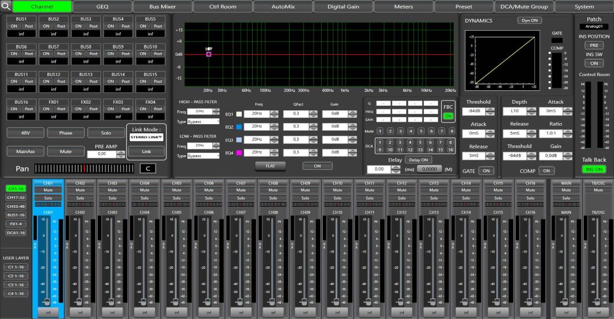 Для работы в больших комплектах звукоусиления (особенно на концертных мероприятиях) предусмотрены развернутые, востребованные опытными режиссерами возможности конфигурирования маршрутизации сигналов. Речь идет о 12 DCA-группах, 8 MUTE-группах и 8 шинах. Этого более чем достаточно для создания персональной палитры микширования и распределения сигналов во входных и выходных секциях микшера.